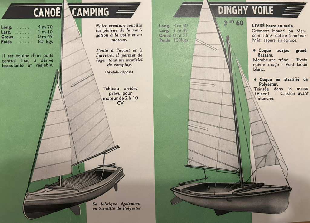 des canots dinghy mixtes sans pontage à l’arrière que l’on pouvait utiliser au moteur à la rame ou à la voile (en rajoutant dérive et gréement) et aussi le canoë camping avec pontage arrière