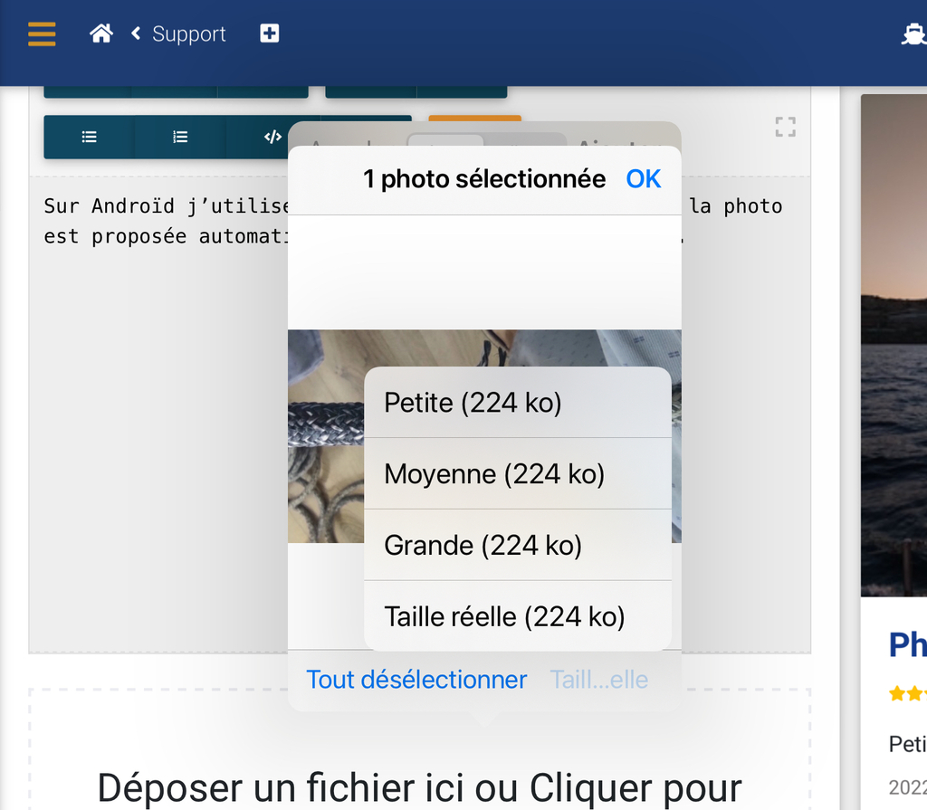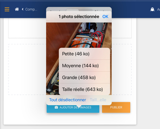 Sur iPad la taille de la photo est proposée automatiquement au choix avant de poster.