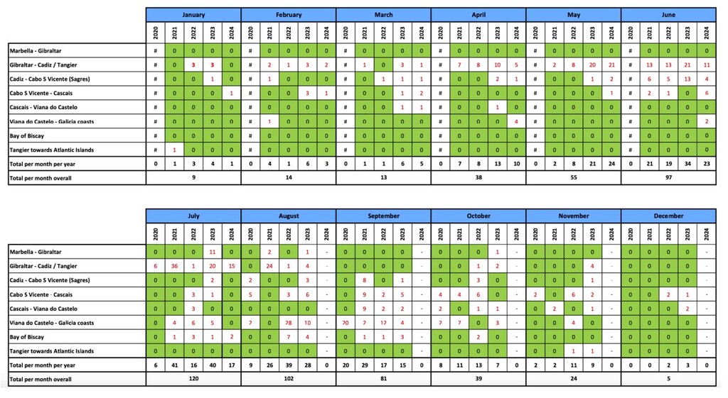 Uniquement sur ce que je peux en dire étant sur place en 2024 à Ribeira ria de Arousa 3 bateaux percutés par des orques en 96 heures dont deux voiliers endommagés et un seul non manoeuvrant, le troisième bateau ayant seulement vu des orques. Durant l'été 2 bateaux sorties de l'eau à Nazaré,un à Viana do Castelo, trois à Povia do Varzim, un à La Corogne, un près de Santabder.Vu le nombre de bateau qui passent c'est très peu mais ça a couté cher à leur propriétaire. Une connaissance à Cadix et une à Faro sur deux catamarans.Le site orcas.pt recensce les déclarations faites par les plaisanciers et par les autorités.A ma connaisance une déclaration n'a pas été faite bien que la guardia civile soit passé voir le bateau à sec,