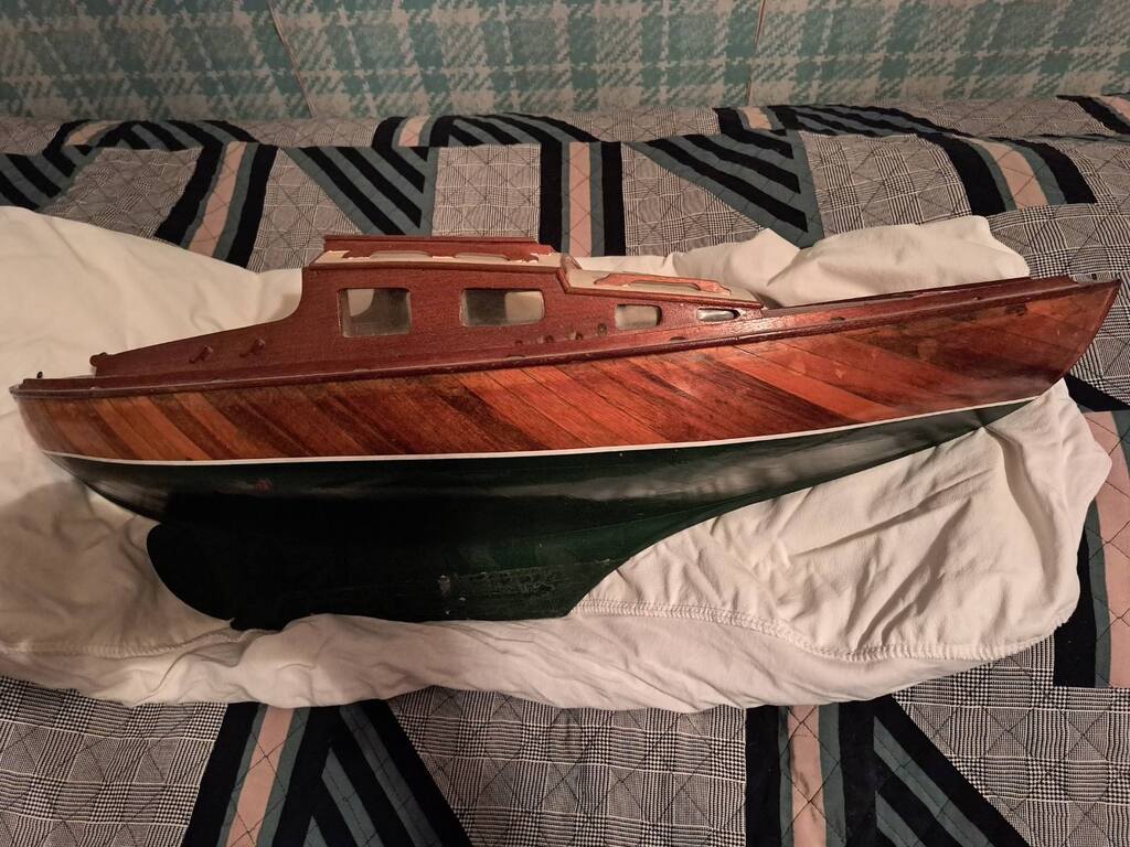 Ce serait une maquette datant de 1946-47 d’un chantier naval de la Ciotat pour un voilier autour des 10 mètres appelé Garlaban. La coque de la maquette est en bois moulé. Environ 80cm.