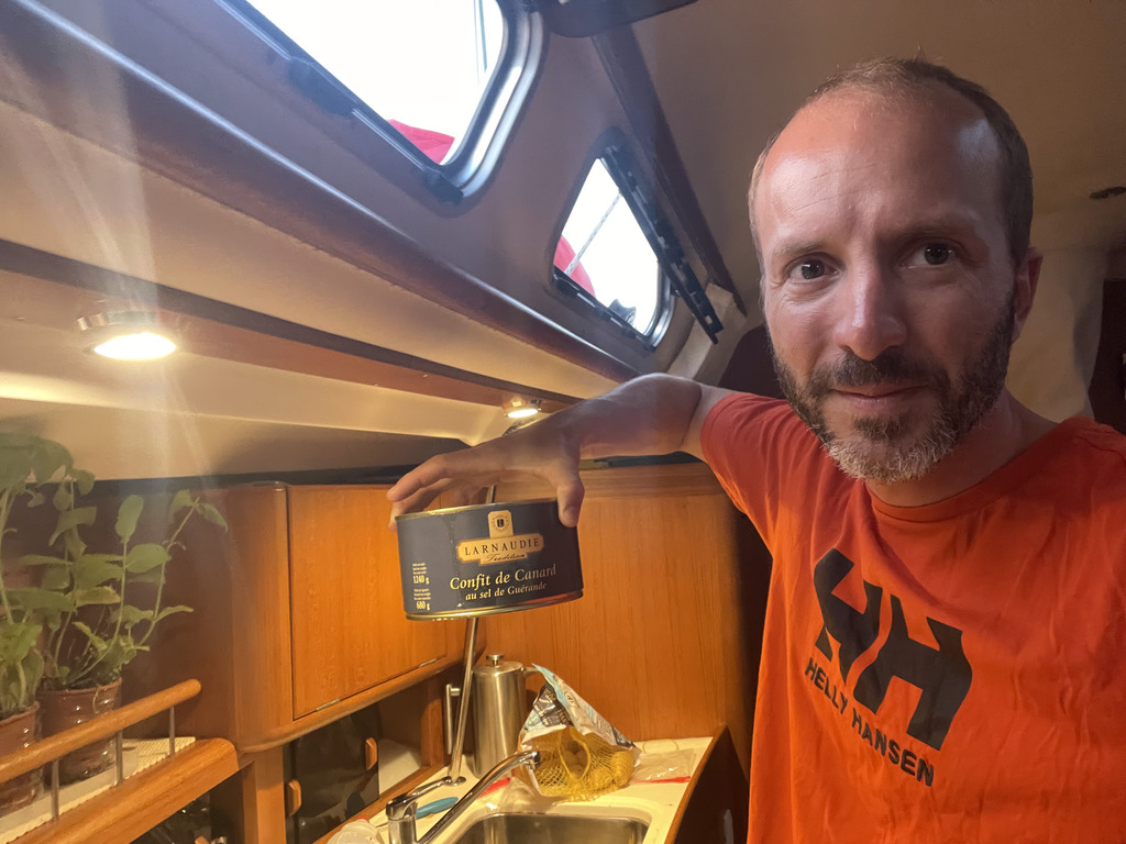 Je cuisine assez peu en navigation étant sujet au mal de mer, mais je cuisine à terre avant de partir, et d'une manière plus générale j'occupe les journées d'hiver à préparer des pâtés, des confits, du foie, des magrets séchés, des sauces, des conserves, etc… que l'on consomme pendant les sorties. Et je me rattrape bien aux escales avec les produits locaux ou ma pêche. Je reconnais que je ne suis pas très doué pour cuisiner les légumes.