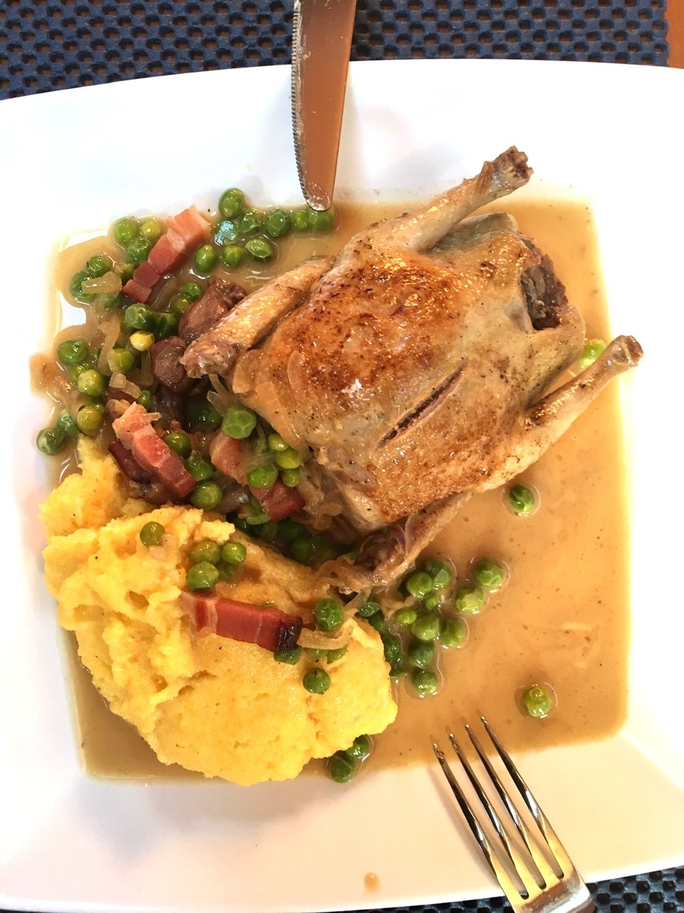 On mange assez rarement de la viande à bord mais je garde un souvenir ému d’un pigeon aux petits pois.