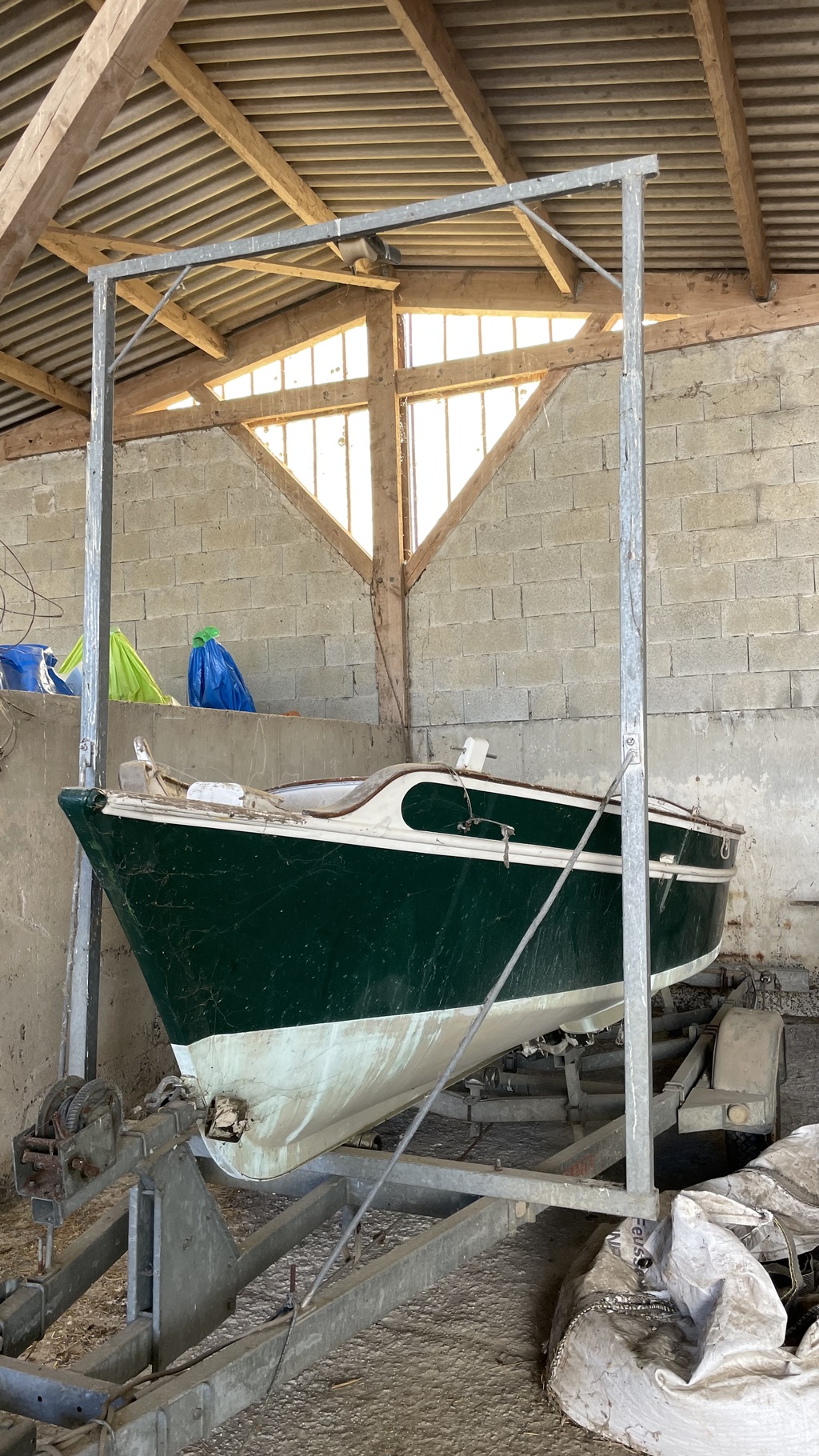 Plutôt qu’une chèvre sur le bateau le premier propriétaire avait donc réalisé un portique fixe sur la remorque. Il est en galva, télescopique, haubané, avec un réa. Les plats qui portent le réa dépassent largement et sont évasés vers l’extérieur de façon à guider le mat qd on le redresse. Une simple estrope en sangle est fixée sur la mât au point d’équilibre. Ca permet de mâter depuis le cockpit avec un palan, ou depuis le sol avec un palan ou le treuil de la remorque et un bout et une poulie de renvoi pour redresser le mât.